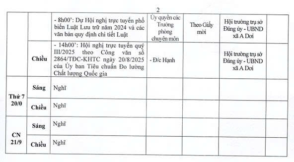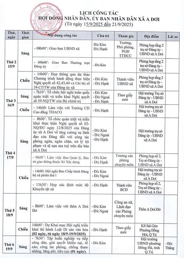 LỊCH LÀM VIỆC CỦA HĐND-UBND XÃ A DƠI (Từ ngày 15/9 đến 21/9/2025) LẦN 2