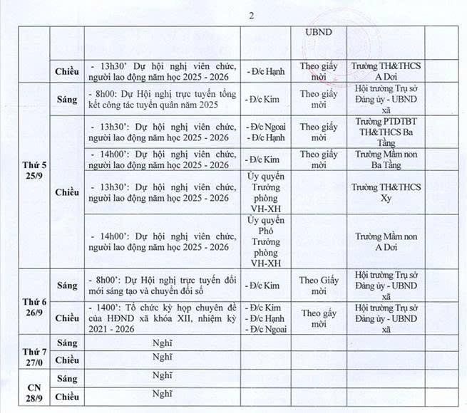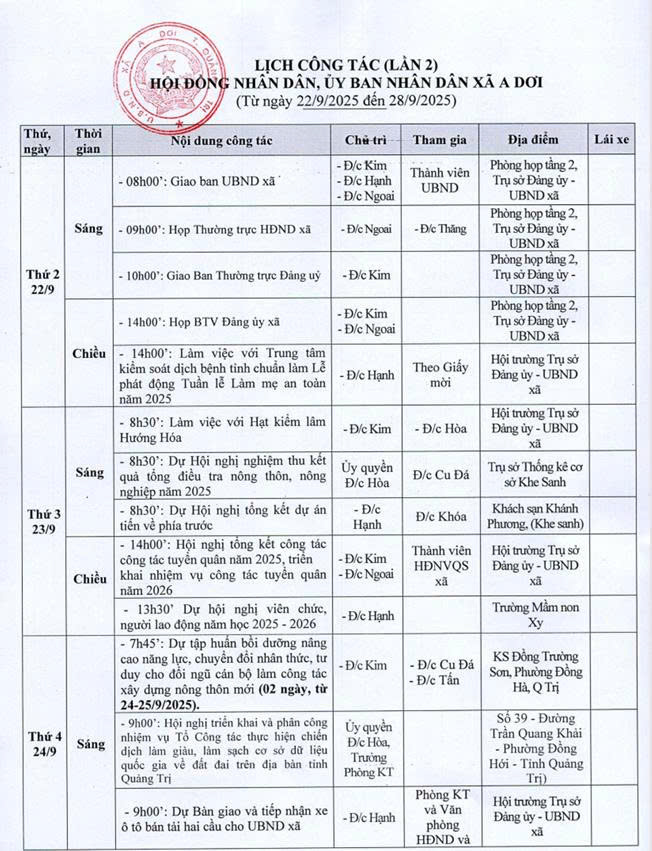 LỊCH LÀM VIỆC CỦA HĐND-UBND XÃ A DƠI (Từ ngày 22/9 đến 28/9/2025)
