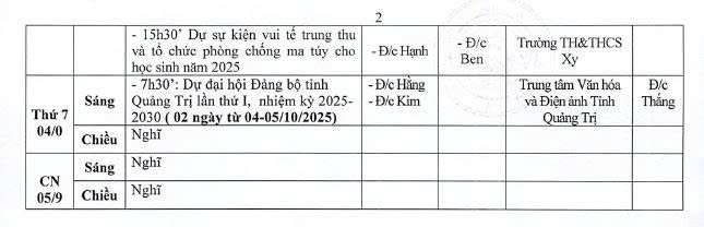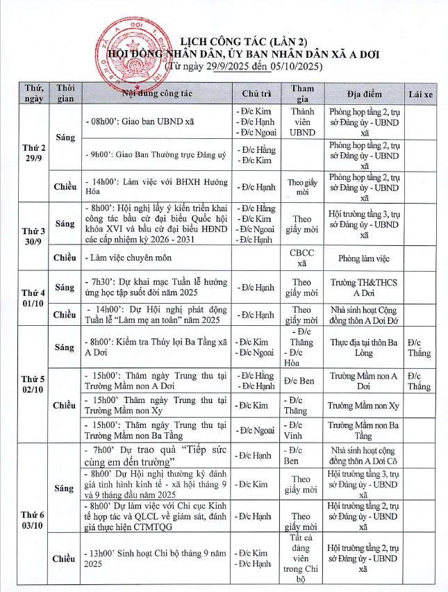 LỊCH LÀM VIỆC CỦA HĐND-UBND XÃ A DƠI (Từ ngày 29/9 đến 05/10/2025)